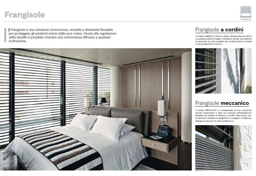 Realizzati con materiali resistenti e durevoli, i frangisole permettono di abbassare la temperatura interna fino a 9°C, migliorando il comfort abitativo e l’efficienza energetica. Possono essere installati all’esterno e sono disponibili in diverse versioni orientabili.